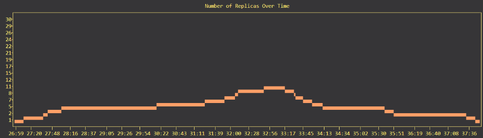 Locust was use for load testing the auto-scaling engine. The graph below shows the number of replicas over time as bell-shaped load was applied.